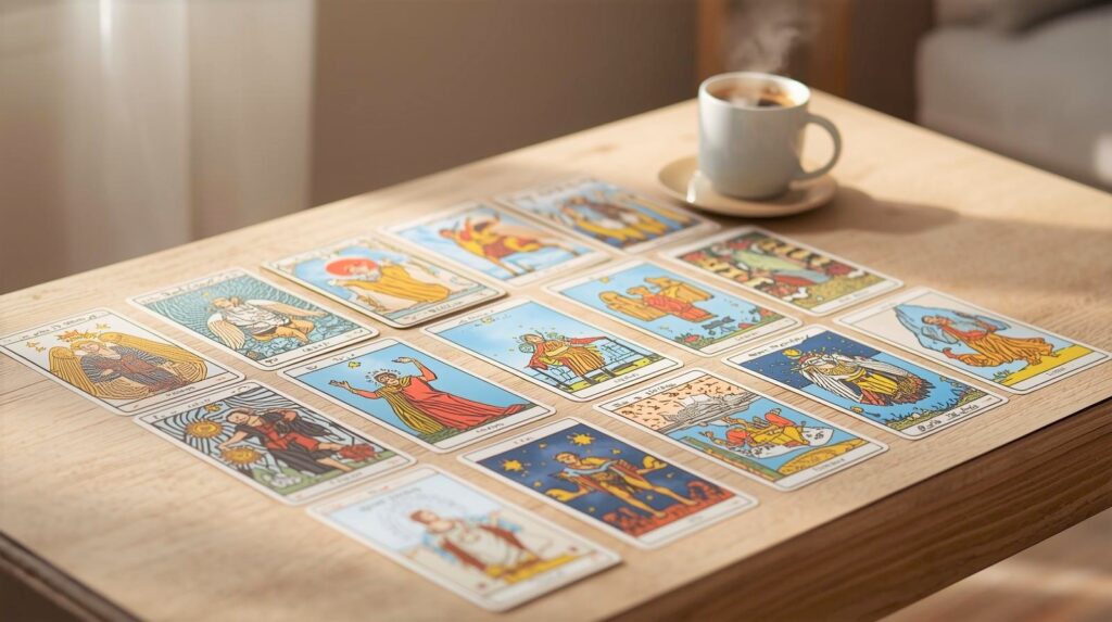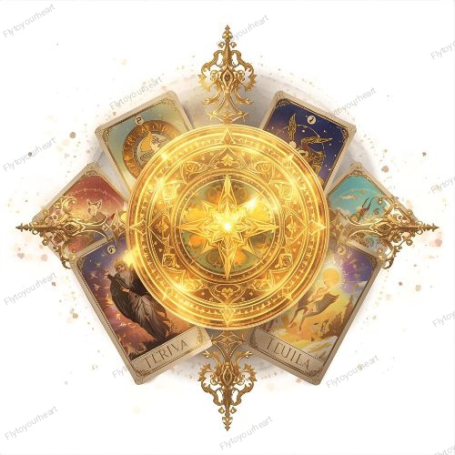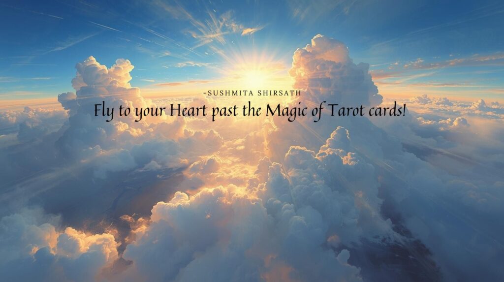 The Tarot cards behind her tell a story—of lessons learned, of inner truth, of a soul ready to soar.
