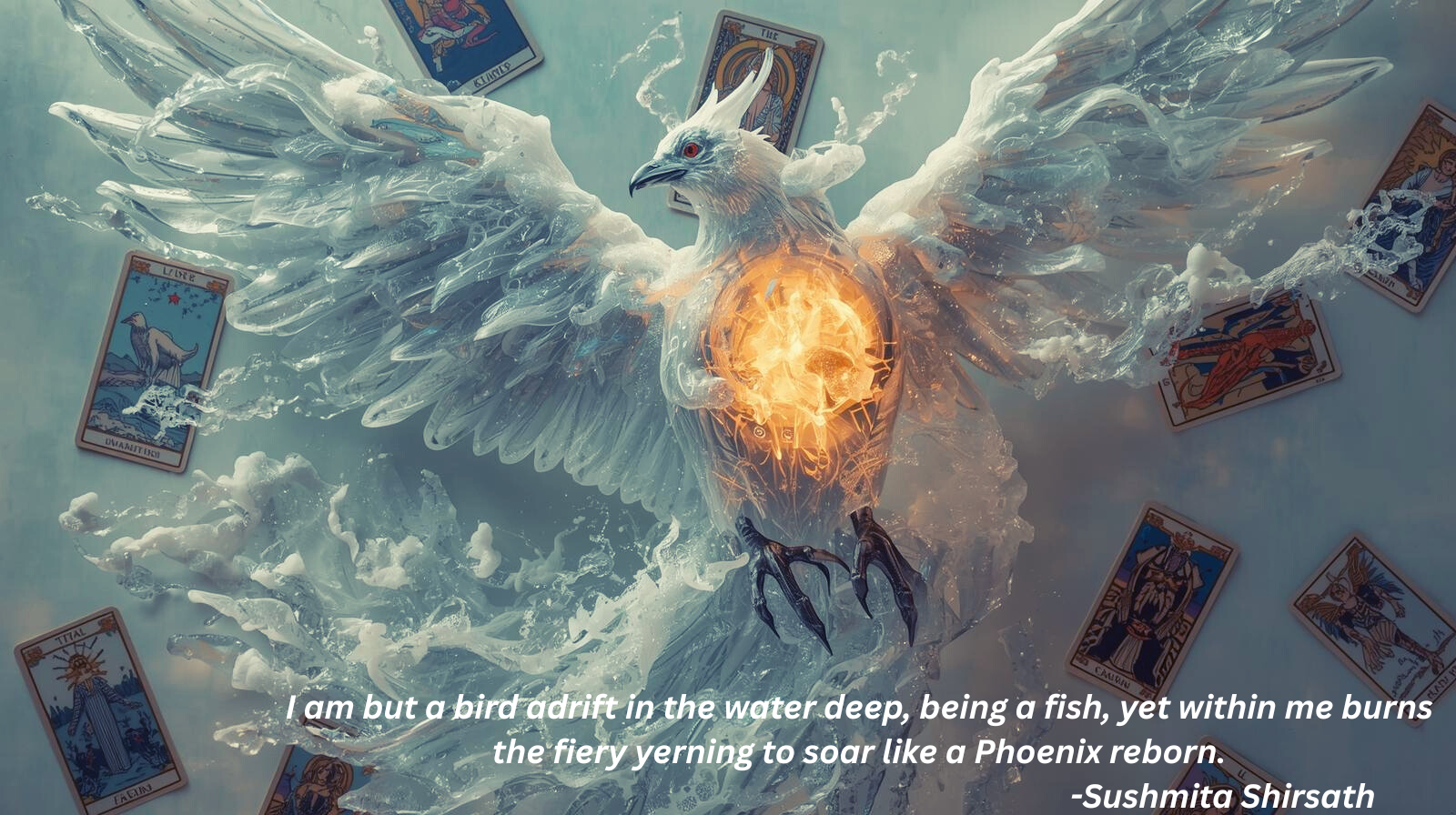 Below is a Picture. In it is a Bird called Phoenix but she is born in the deep ocean with gills to herself and flow as a Whale and with scale and feathers together she felt unique. Depth of the Ocean felt home where she learned to navigate, to feel, and to trust her inner voice. Through the waves and storms, she became wise, creative, and deeply intuitive.